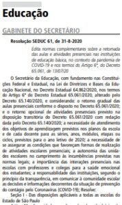 A retomada efetiva, mas ainda gradual e restrita do calendário letivo, é prevista para 7 de outubro.