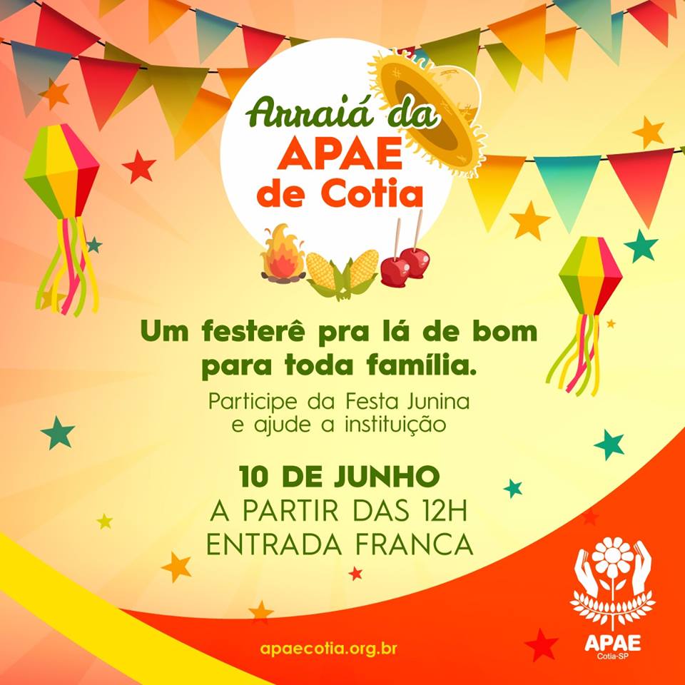 Acontece no próximo dia 10 de junho (sábado), o “Arraiá” da Apae de Cotia, um “festerê” lindo para toda a família se divertir e ainda contribuir com os projetos da instituição.