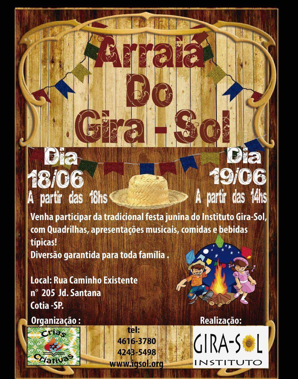Nos próximos dias 18 de junho, às 18h, e 19 de junho, às 14h, acontece o Arraiá do Gira-Sol, do Instituto Gira-Sol, em Cotia.