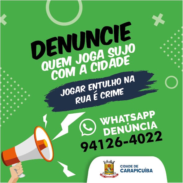 Na quarta-feira, 2, a Prefeitura lançou a campanha “Fiscal do Entulho”. Agora, por meio do WhatsApp Denúncia, o morador de Carapicuíba pode ajudar no combate ao descarte irregular de entulho em locais públicos.