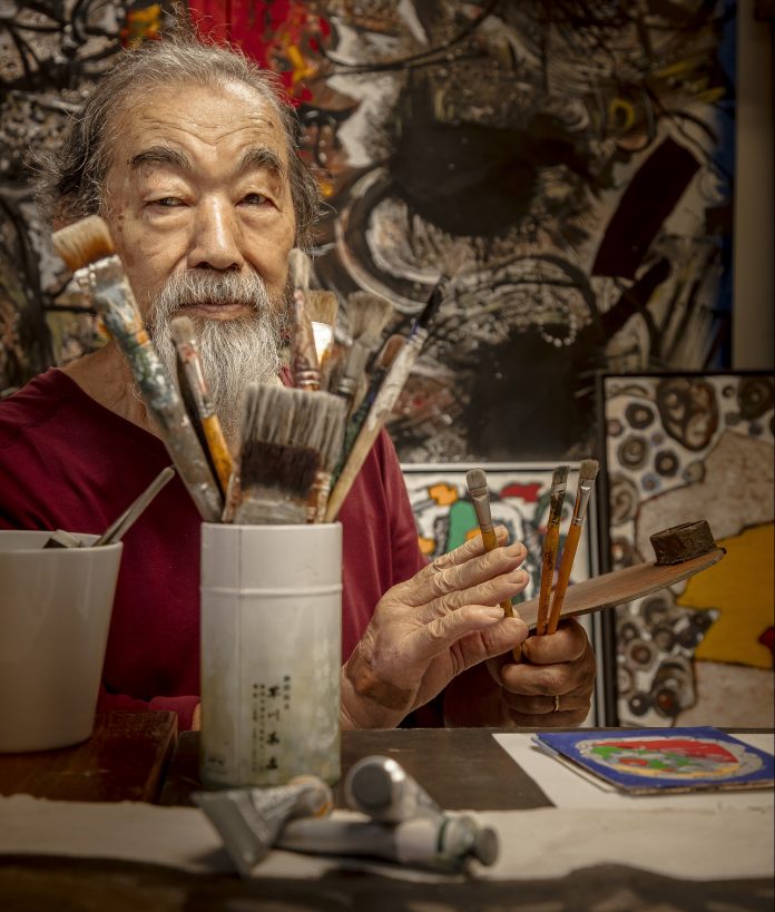 Artista plástico, ator e escritor. O japonês naturalizado brasileiro, fugitivo da guerra, Kenichi Ken Kaneko é um multiartista granjeiro. Morador daqui há mais de 35 anos, é um personagem típico da região. Se você não o encontrou na feira de domingo, com certeza já viu ao menos um comercial de TV com ele. Participou de diversas novelas e minisséries, além de atuar em teatro e cinema. Um de seus papéis principais foi na novela Os Imigrantes, da TV Bandeirantes, e também um papel marcante no filme de Tizuka Yamasaki, Gaijin – Os Caminhos da Liberdade (1980). Já trabalhou diversas vezes nas “pegadinhas de domingo” do SBT, no programa de Silvio Santos. Ele é uma comédia. Adora contar histórias, como vê a sua obra e como gostaria que fosse o mercado de arte. É um artista nato. Pinta desde os 10 anos e sua primeira exposição ocorreu quando tinha apenas 14. Nascido em Yokohama, província de Kanagawa, no Japão, é formado pela Escola de Belas Artes “Chuô Bijutu Gakuem” de Tóquio. Chegou ao Brasil em 1960 e logo participou da Bienal Internacional de São Paulo. Pintor compulsivo, ele desenha todos os dias, tem obras em diversos acervos e não para nunca. Está sempre ativo. Consertando seus quadros antigos, pintando, desenhando, ou mesmo indo para São Paulo, dirigindo (sim, ele ainda dirige!), para participar de algum teste para comercial ou filme. Amigo pessoal de Tomie Ohtake e de Shoko Suzuki – esta, uma das ceramistas mais importantes do Brasil, e também moradora da Granja Viana, com quem convive quase que diariamente, é sua comadre. Já com Tomie, Kaneko foi um dos fundadores do grupo Seibe, que agitou a cultura paulista nos anos 1970, com Manabu Nabe. Ele acabou de completar 84 anos agora, no fim de março. E logo em seguida, inaugura uma exposição individual, com sua trajetória artística, no Centro Cultural dos Correios, em São Paulo. Kaneko é artista pleno. Fala com o corpo e com alma. Carismático, recebeu a revista Circuito, em uma tarde quentíssima de verão, em sua casa-ateliê, localizada no miolo da Granja. Lugar que ele mesmo construiu, com sua segunda esposa, a já falecida artista Mariko Kaneko. Em abril de 2019, fizemos uma entrevista de capa com o artista em que ele conversou com nossa equipe por quase três horas, com muito chá e risadas.