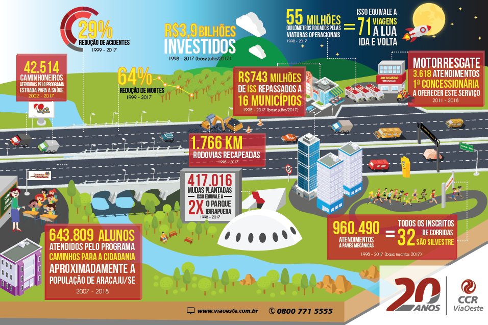 Em 2018, a CCR ViaOeste celebra o 20º ano de administração do Sistema Castello-Raposo. No período, a concessionária já investiu mais de R$ 3,9 bilhões no segmento, contribuindo diretamente para o desenvolvimento sustentável de toda a Região Oeste do Estado de São Paulo.