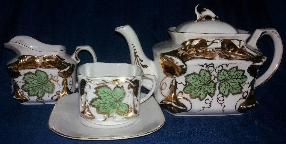 Porcelana branca com douração. Decoração de folhas verdes de parreira e ipomeias douradas com inspiração art nouveau