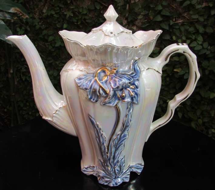 Porcelana branca com acabamento perolado. Corpo do bule com divisões verticais bem marcadas para destacar a representação de flor e folhas ao estilo art nouveau.