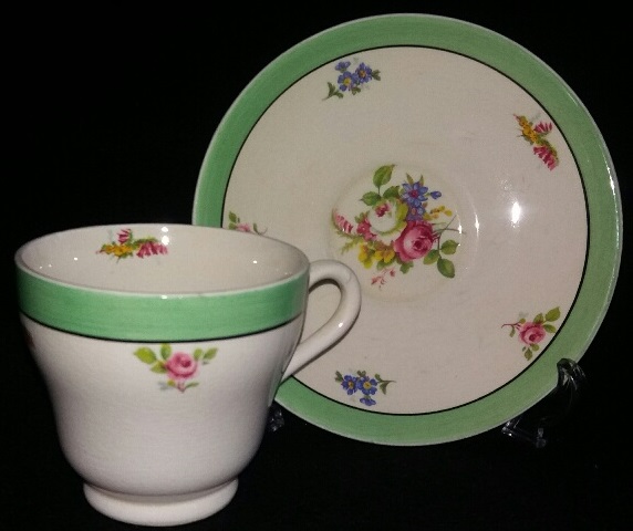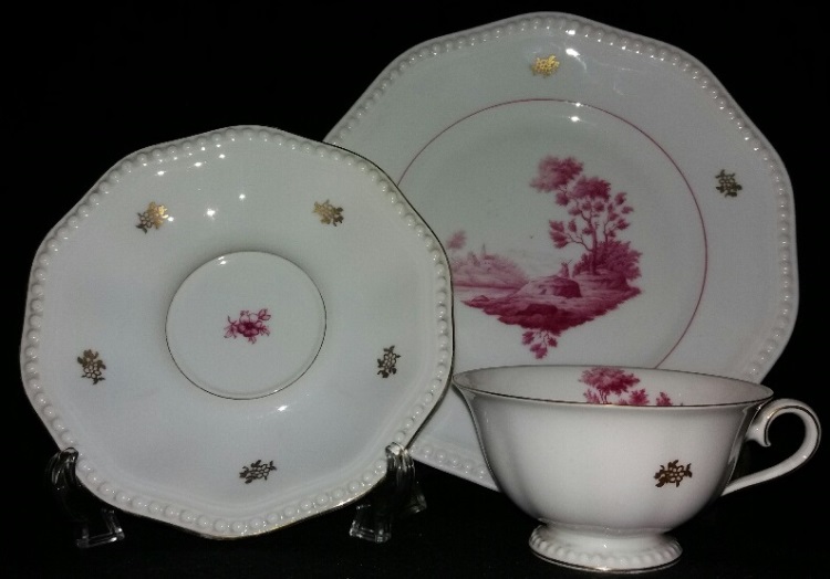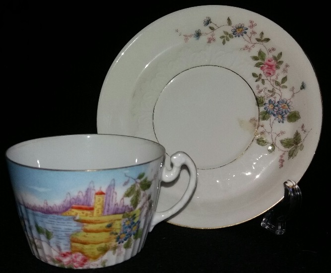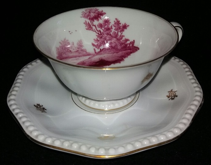 Marca: Albert Pillivuyt. Procedência: Limoges-França. O pires é identificado com a marca de uma loja de Montevidéu, Uruguai.