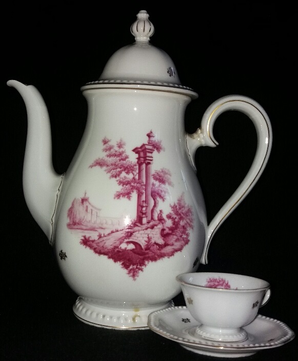 Porcelana branca decorada ao estilo Dresden: representação de flores multicoloridas e frisos dourados. As linhas onduladas, alça em curva e contra curva e corpo em gomos remete à opulência do barroco.