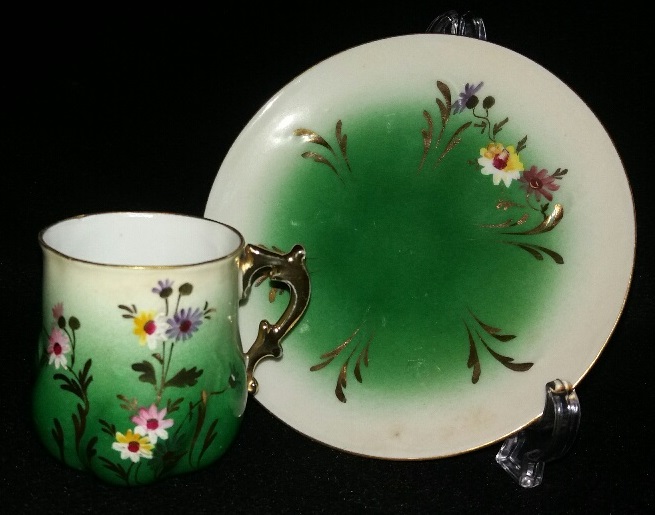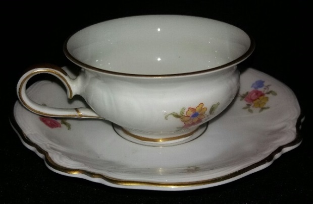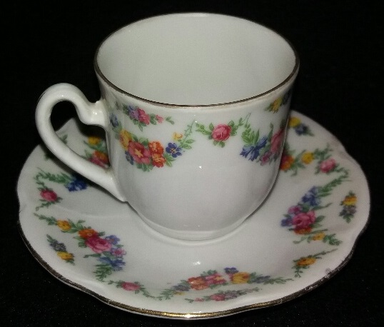 Sem marca. Números impressos na xícara 2875 e 0. Números pintado, 2190 e 22 na xícara e 22 e 32 no pires. Há no fundo da xícara marca impressa que remete à manufatura Elbogen da República Tcheca.