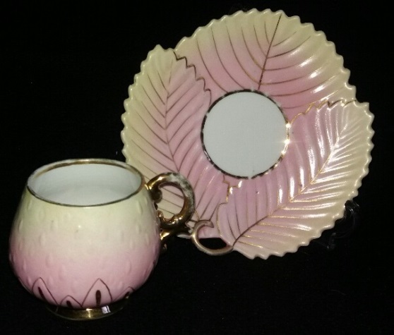 Porcelana branca e cor-de-rosa em degradê com douração. Pires em forma de três folhas com nervuras em relevo.