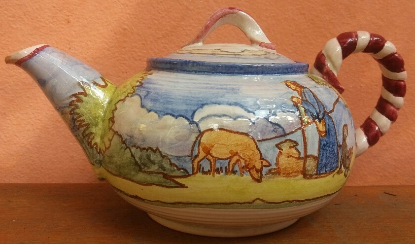 Cerâmica vitrificada com cenário campestre. Um lado apresenta cena com ovelhas e no oposto, pastor, ovelhas e cão.