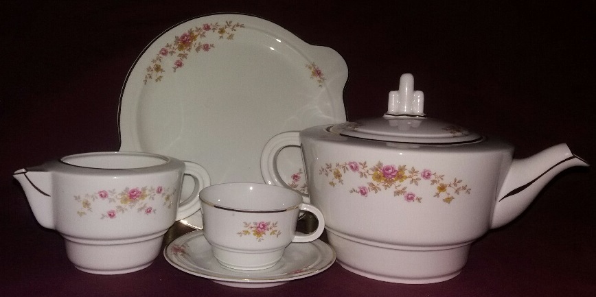 Porcelana branca decorada com flores miúdas dispostas em festões e frisos dourados. O cuidado nas proporções e a harmonia entre os elementos das peças denotam concepção no estilo funcional da década de 1950.