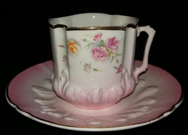 Porcelana branca cor de rosa, com bordas douradas e pequenas flores coloridas. Base da xícara e borda do pires com motivos florais em relevo.