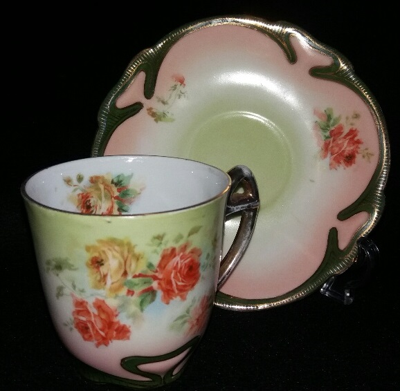 Porcelana branca e três cores em tons pasteis decorada com flores e dourado. Borda do pires e base da xícara arrematadas por moldura sinuosa ao estilo art nouveau.