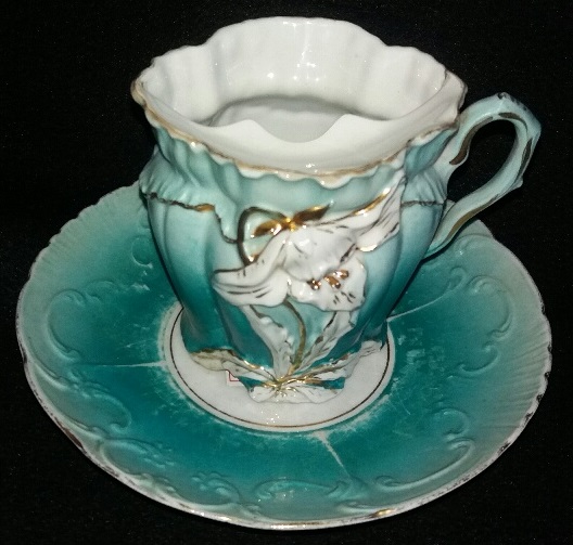 Rara xícara com proteção para bigode em ótimo estado de conservação. Porcelana branca e azul com elementos dourados. Pires com arabescos em relevo. Xícara com flor em relevo no padrão art nouveau.