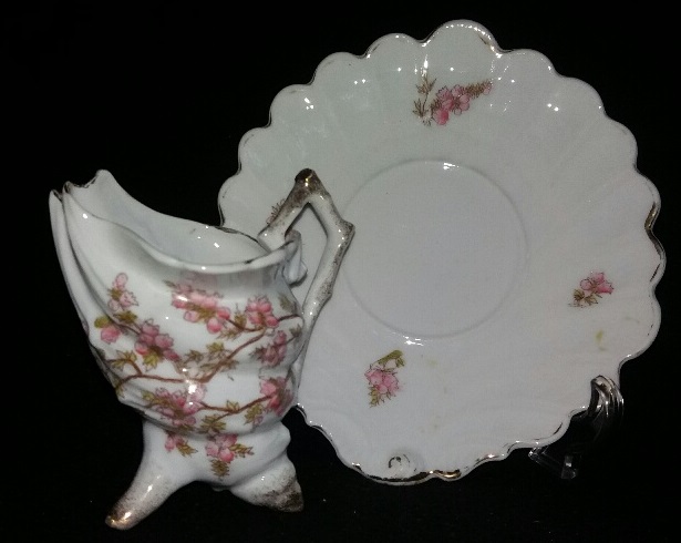 Porcelana branca decorada com dourado e flores cor salmão. O pires tem a forma de uma concha marítima plana e a xícara copia a forma de uma concha caramujo.