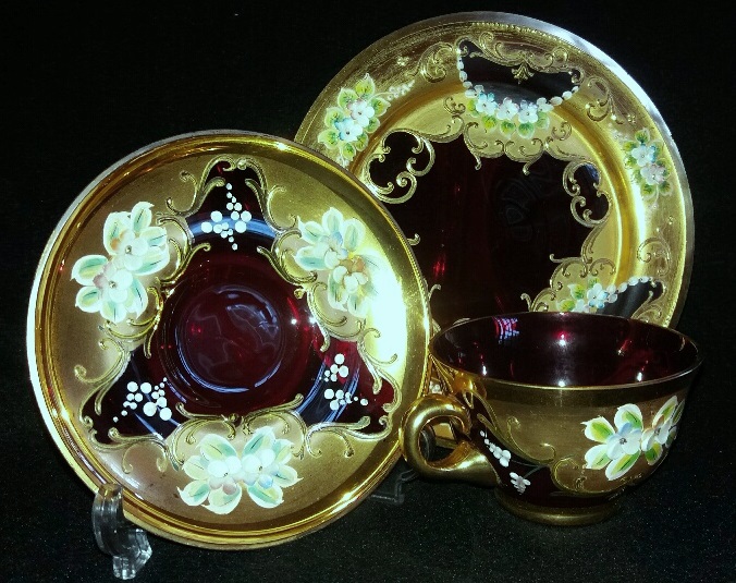 Vidro vermelho com profusa decoração em dourado e flores pintadas à mão.