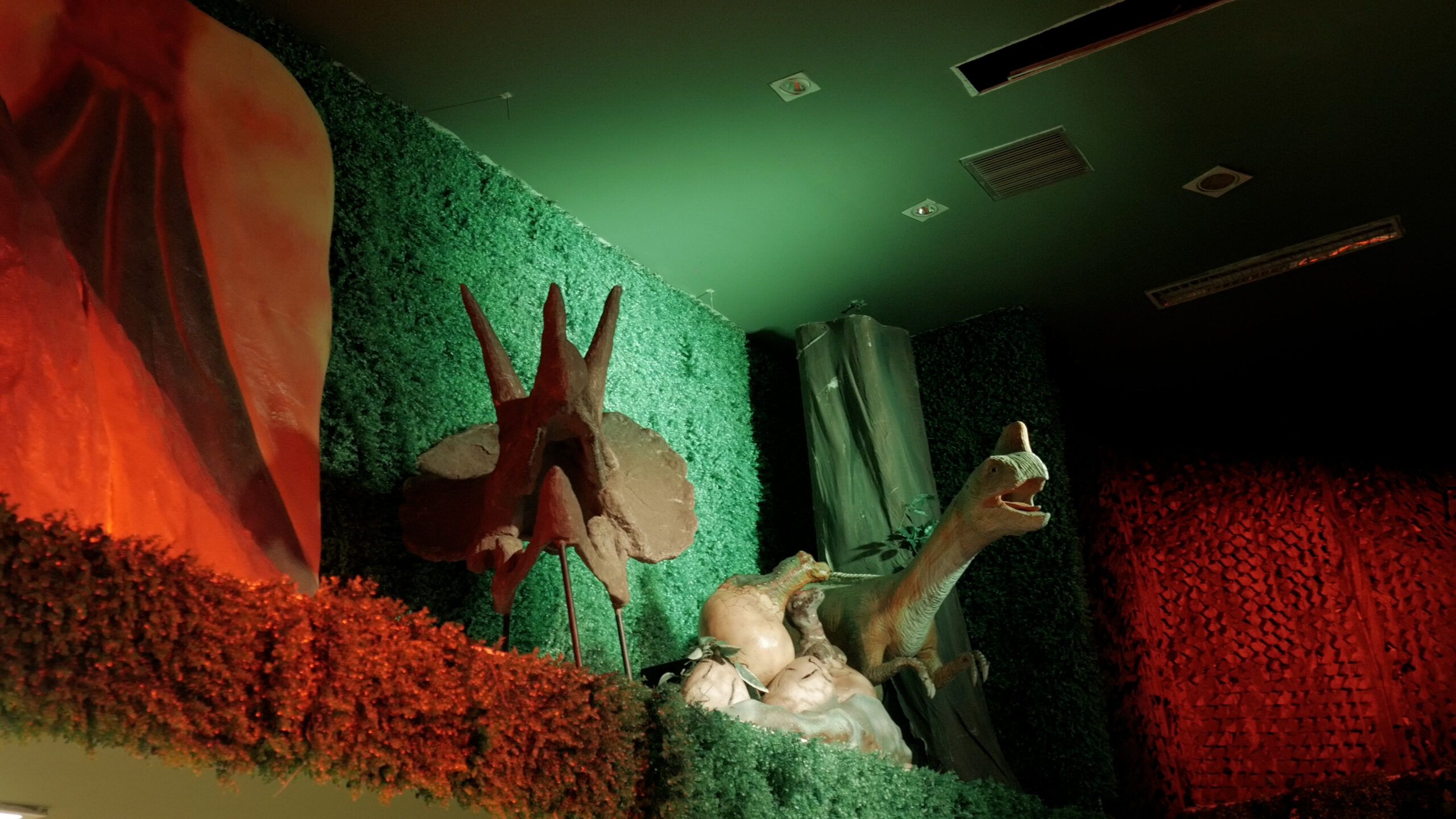A cenografia tem um conceito inédito, uma selva ao redor de todo espaço com vulcões, pedras, cachoeiras e mais de 20 dinossauros, alguns estáticos e, mais de seis percorrem o ambiente fazendo performances e interagindo com o público, garantindo assim momentos de muita emoção e surpresas.
