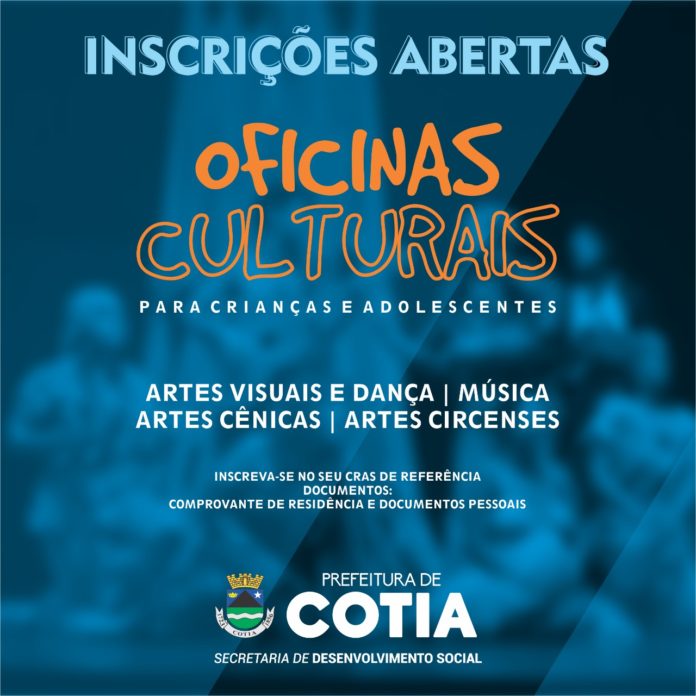 A Prefeitura de Cotia está com as inscrições abertas para as novas oficinas culturais oferecidas para crianças e adolescentes, com idade entre sete e 17 anos, do município. As novas oficinas são Artes Visuais, Artes Cênicas, Dança, Artes Circenses e Música.
