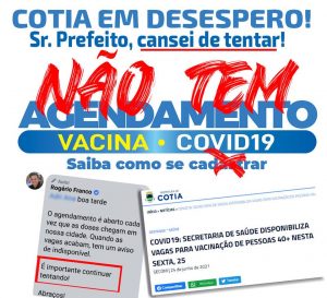 Ele chegou, inclusive, a criar uma campanha no Facebook para “denunciar esse descaso para tentar ajudar essas pessoas que carecem de informação”, como descreve. O anúncio chamado Cotia em desespero! Não tem agendamento! já tem mais de 20 compartilhamentos e 114 comentários, todos de moradores pontuando a mesma dificuldade. “O maior problema em relação aos agendamentos é a mecânica arcaica do sistema, a forma como tratam mal os cidadãos cotianos, que tem de perder ao menos 30 minutos diários de suas vidas (houve relatos de 1 semana de tentativas) para ‘continuar tentando’, como insiste em dizer o Prefeito da cidade. Ao final das ligações não existe nenhuma informação ou justificativa, apenas ‘batem’ o telefone na sua cara. Seria muito fácil ‘melhorar’ esse sistema para poupar esse constrangimento: humaniza-lo”, sugere José Roberto.