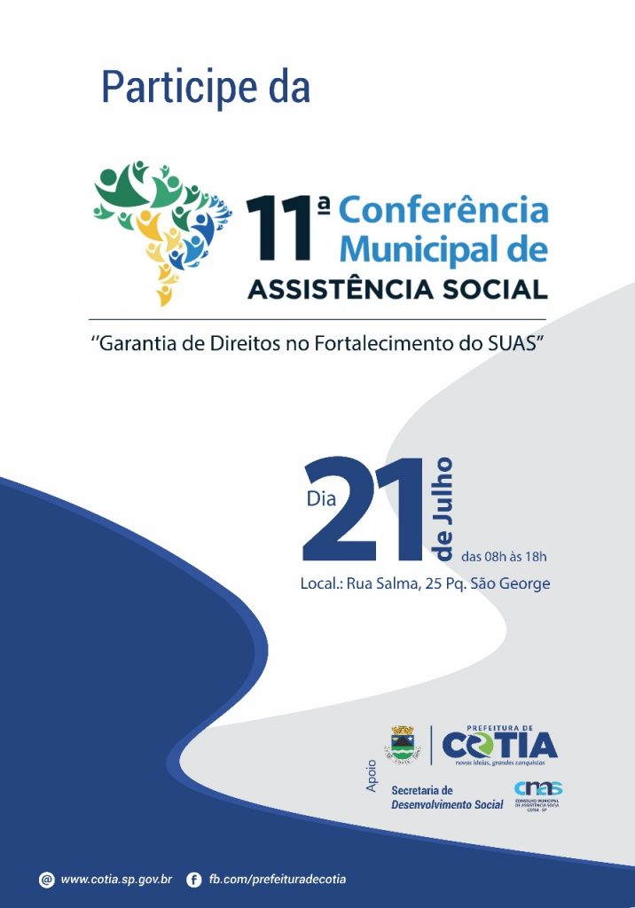 Na sexta-feira (21), das 8h às 18h, a Secretaria de Desenvolvimento Social e o Conselho Municipal de Desenvolvimento Social de Cotia realizam a XI Conferência Municipal de Assistência Social, evento que acontece a cada dois anos em todo o País. Este ano, o tema geral do evento será “Garantia de Direitos no Fortalecimento do SUAS [Sistema Único de Assistência Social]”.