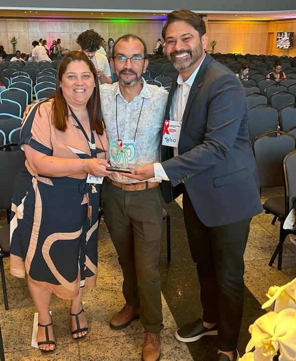 Os colaboradores Gislayne Sanches, Enfermeira da Vigilância Epidemiológica de Cotia, e Nélio Girardo, Coordenador Municipal do Programa IST/HIV/AIDS/HV e do SAE/CTA, estiveram em São Paulo no evento de premiação que foi entregue por Alexandre Gonçalves, Coordenador do Programa Estadual de IST/AIDS de São Paulo e Diretor do CRT-SP.