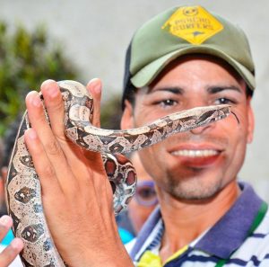 Técnico em enfermagem, Marcelo tem 36 anos e hoje faz faculdade de biologia. Já fez cursos de manejo de animais silvestres e peçonhentos no Butantã, onde também estagiou e hoje trabalha na Secretaria de Meio Ambiente de Carapicuíba fazendo o que já fazia desde os 17 anos voluntariamente, mas agora como profissional contratado. “Eu sempre gostei de cultivar árvores e resgatar animais”, conta. Animais machucados ele leva para o Centro de Triagem de Animais Silvestres (CETAS Barueri) e animais saudáveis  ele solta em local apropriado e seguro (matas preservadas) na região.  O futuro biólogo faz resgate até de enxames de  abelhas e marimbondos!