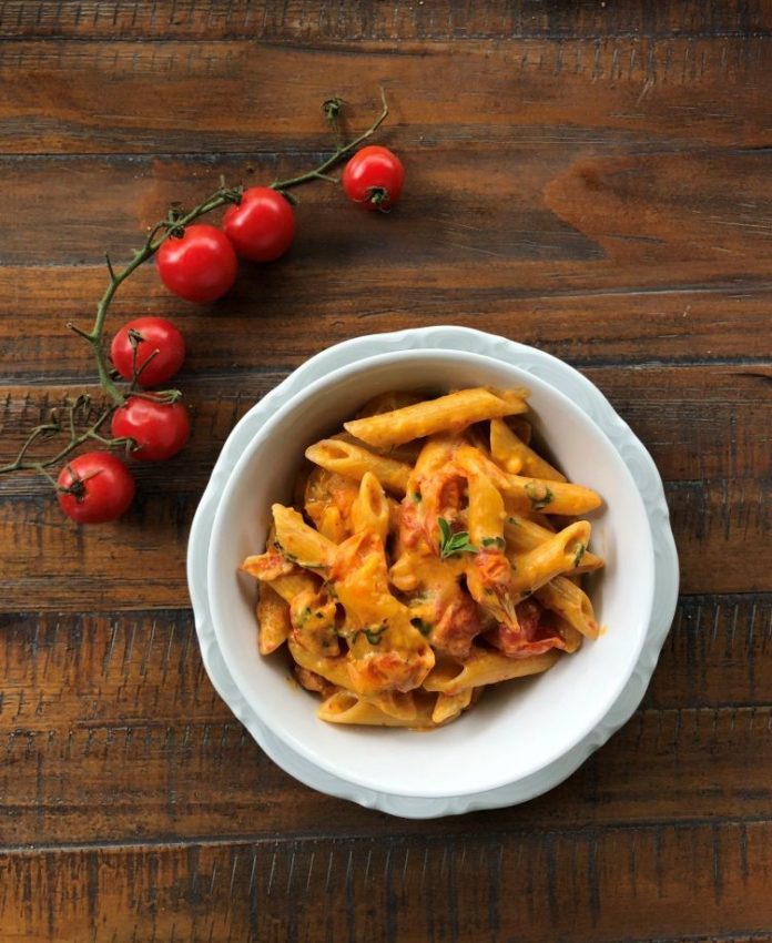 Rigatoni ao forno com Molho de Queijo Brie, Mix de Tomatinhos e Crispy de Parma