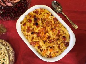 Colocar em uma assadeira ou frigideira que possa ir ao forno, os tomatinhos inteiros, o bacon em cubos médios, o dente de alho em lâminas e no centro da assadeira o queijo cheddar.