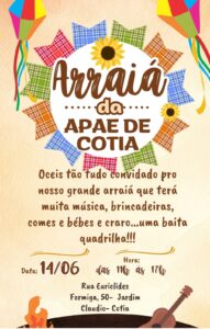 Pra contribuir com os projetos desenvolvidos pela Apae de Cotia, encontrar os amigos e se divertir muito! Vai ter muita música, brincadeiras, comes e bebes e uma baita quadrilha! Prestigie!