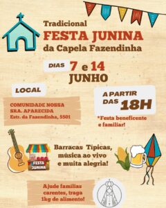 A tradicional Festa Junina da Comunidade Nossa Senhora Aparecida, na Granja Viana, em Carapicuíba, em sua vigésima edição, este ano será em dose dupla, dias 07 e 14/06, a partir das 18 horas. Com comidinhas e bebidas típicas, música ao vivo, bingo, sorteio de prendas e fogueira para esquentar o clima, a festa promete muita animação. A entrada é franca. Os organizadores pedem apenas a contribuição com um quilo de alimento não perecível para doação a famílias em situação de vulnerabilidade da região.