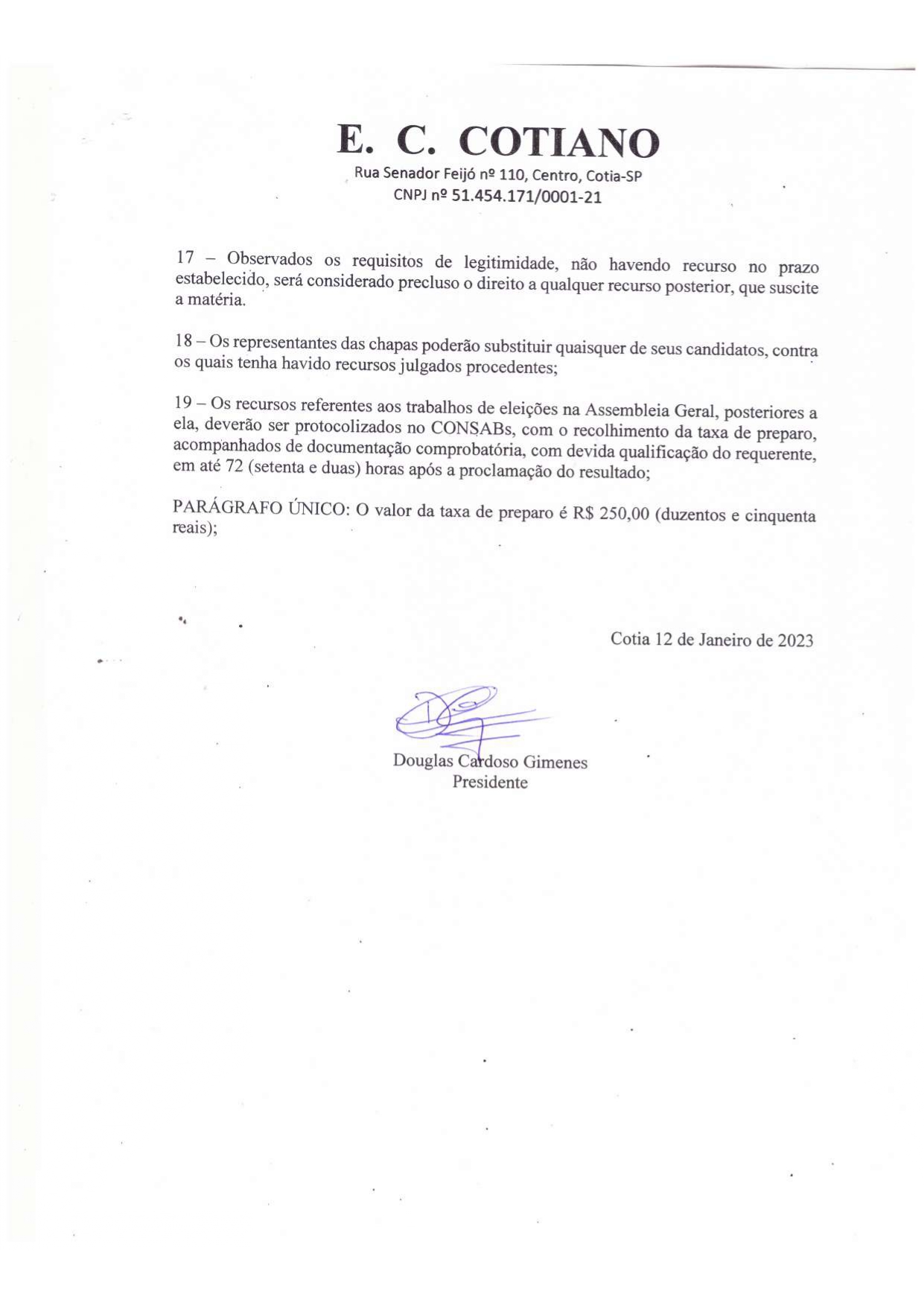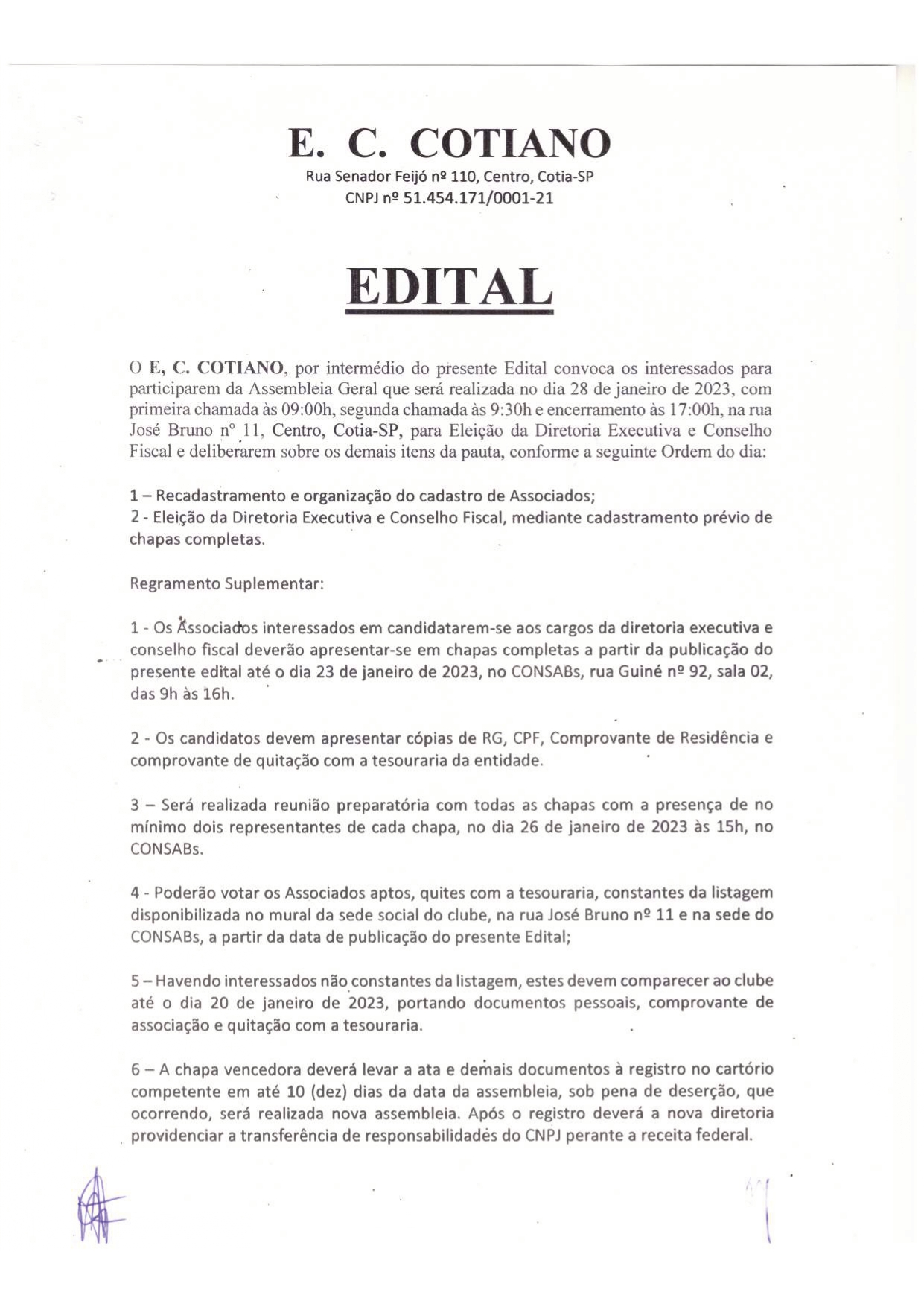 Em edital publicado nesta quinta-feira (12/01), o Esporte Clube Cotiano convoca os interessados para participarem da Assembleia Geral que será realizada no dia 28 de janeiro de 2023, para Eleição da Diretoria Executiva e Conselho Fiscal.