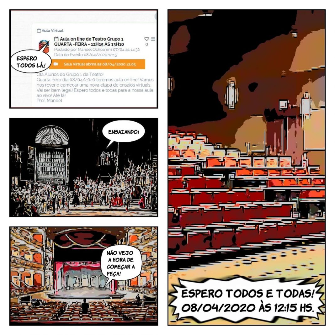 Como transformar as aulas de teatro, tão corpo a corpo, em aulas à distância? Essa pergunta desafiou o professor Manoel Ochoa, que foi pesquisar ferramentas online que pudessem atrair os alunos tão acostumados com o dia a dia das encenações. Descobriu aplicativos que transformam fotos em imagens estilizadas como as dos quadrinhos. Depois encontrou outro que coloca uma foto 3×4 como rosto de personagens de animação e assim foi percebendo que poderia utilizar estes materiais para chamar a atenção dos alunos para as suas aulas à distância.