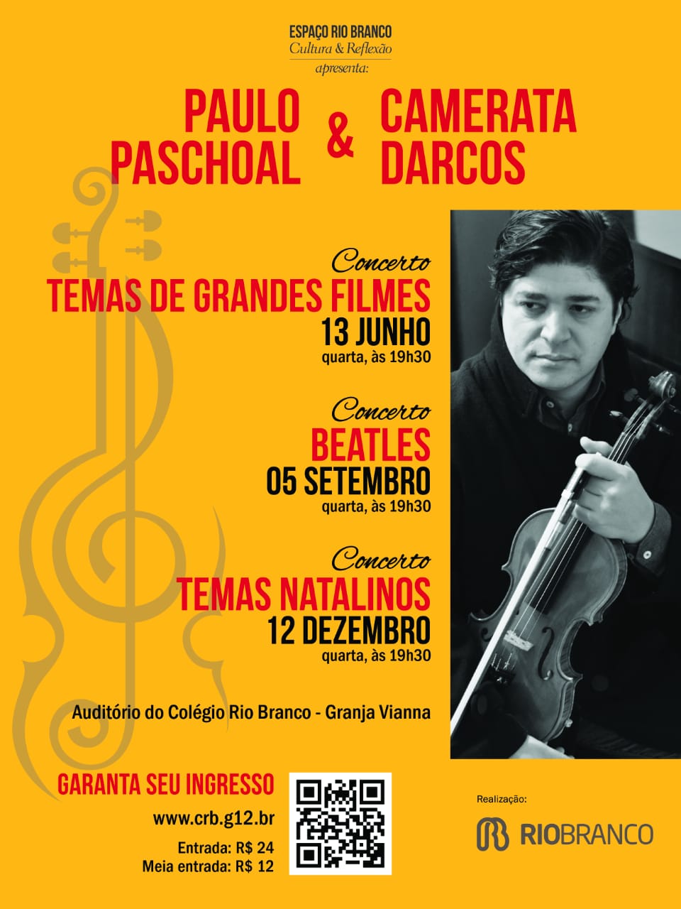 O Espaço Rio Branco apresenta no próximo dia 13 de junho, às 19h30, o concerto Temas de Grandes Filmes, com Paulo Paschoal e Camerata Darcos.