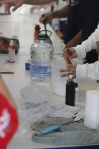 O desenvolvimento do produto foi feito no laboratório de química, sob os cuidados da professora Eugênia Hashiguchi, que ministra a disciplina para os cursos. “Testamos duas fórmulas simples, já disponíveis em sites de internet. Utilizamos ingredientes de fácil disponibilidade e baixo custo, como água destilada, glicerina e vitaminas do complexo B”, explica.