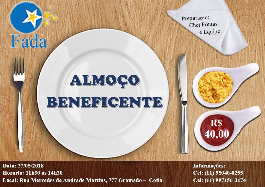 No dia 27 de maio, vai realizar um almoço beneficente para angariar fundos. No cardápio, churrasco de contrafilé, fraldinha, linguiça toscana, sobrecoxa desossada e tupila, acompanhado de arroz, farofa, legumes cozidos, vinagrete e saladas de maionese e verde.