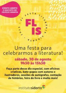 O Instituto Sidarta realiza, no próximo sábado, 30 de agosto, a 2ª edição da Festa Literária Sidarta (FLIS). A programação reunirá autores, ilustradores, livreiros e demais pessoas que atuam pela causa do livro, da leitura, da literatura e das bibliotecas, como espaços vivos de encontro, reflexão e inspiração. Com uma programação diversa das 9h30 às 15h30, o evento é gratuito e aberto à toda a comunidade.