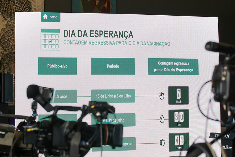 O Governador João Doria anunciou o lançamento do Dia da Esperança, ferramenta que disponibiliza a contagem regressiva para imunização de toda população de SP, de acordo com cada faixa etária. O novo recurso está disponível na plataforma Vacina Já e foi desenvolvido pelas sectetarias de Comunicação e da Saúde, em parceria com a Prodesp, para garantir mais transparência ao processo de vacinação.