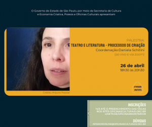Descrição: Nessa palestra a atriz e dramaturga Daniela Schitini vai compartilhar com o público as experiências vivenciadas em espetáculos criados a partir de materiais literários. Abordará processos de criação e procedimentos que tragam pistas sobre a questão: como transformar a literatura em matéria prima para a cena teatral; revelará também os diversos processos de criação de espetáculos inspirados na literatura, onde atuou como atriz. Ao final da palestra serão propostos alguns exercícios e haverá conversa com o público.