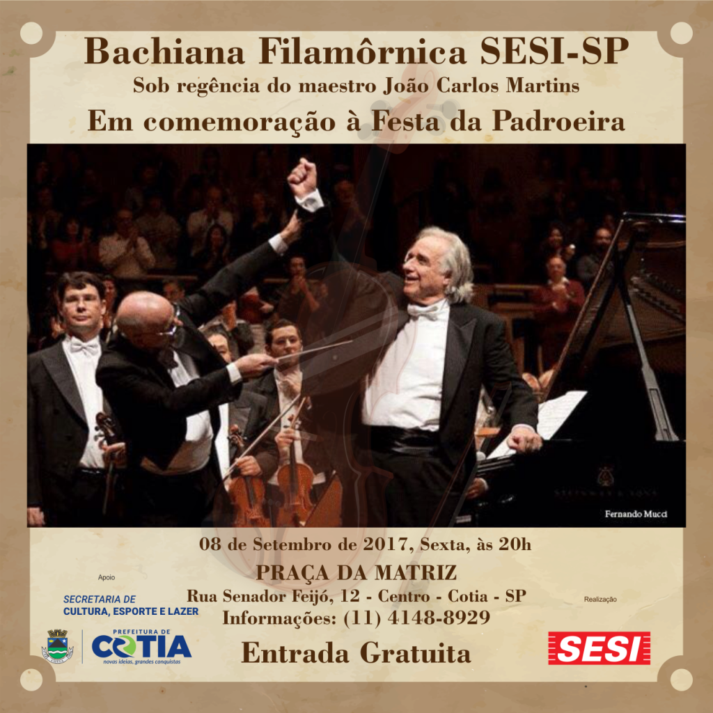 Na sexta-feira, dia 8, às 20h, a Praça da Matriz se transformará em palco para a apresentação da Orquestra Filarmônica Bachiana Brasileira, sob a regência do famoso maestro, João Carlos Martins. Já no dia, 9, às 18h, haverá uma missa solene em honra a São Benedito (Santo co-padroeiro de Cotia). E às 19h30, vai acontecer um Super Bingo.