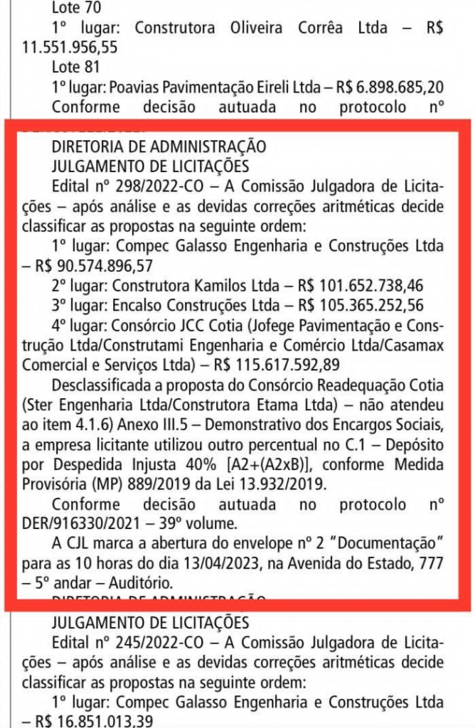 De acordo com Sergio Folha, “ultimamente, ouvimos bastante falar que as obras do viário da Raposo estavam travadas, a mando do governador do Estado ou por dificuldades financeiras. Mas fizemos pesquisas junto ao D.E.R. e constatamos que a licitação está em pleno andamento, com propostas de quatro empresas de grande porte já classificadas. A primeira colocada é a empresa Compec Galasso Engenharia e Construções Ltda. que apresentou o valor de R$ 90.574.896,57. E conforme publicação no Diário Oficial, a abertura do envelope de Documentação está marcada para o dia 13 de abril às 10 horas, no auditório da Avenida do Estado, 777, 5º. Andar.”