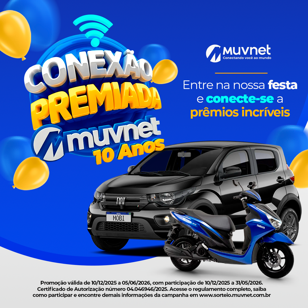 Na iniciativa, todos os clientes concorrem a cinco motos Yamaha por mês, durante cinco meses, e, no sorteio final, a um Fiat Mobi 0 km. A promoção teve início em 10 de dezembro de 2025, com o primeiro sorteio programado para janeiro, e todos os resultados serão realizados com base na Loteria Federal. Para participar, basta se cadastrar no site oficial e conferir o regulamento completo: https://lp.muvnet.com.br/muvnet-10-anos
