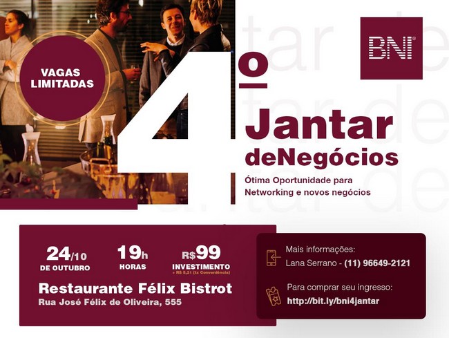 No próximo dia 24 de outubro, quinta-feira, o BNI Invictus, grupo de empresários da Granja Viana e região, vai promover seu 4º Jantar de Negócios, com o objetivo de conectar empresas e fomentar negócios locais.