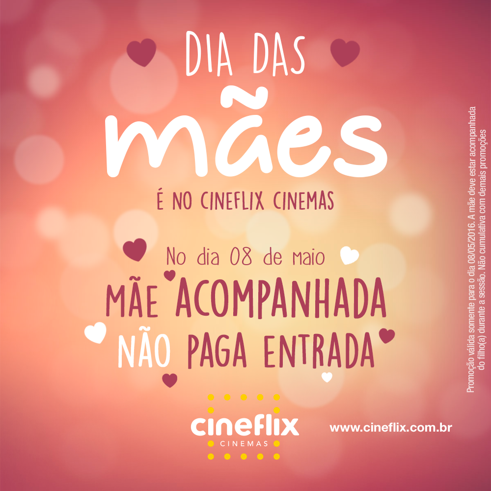No próximo dia 8 de maio, o Cineflix do The Square Open Mall promove uma forma especial de presentear as mães. Para qualquer sessão, todas as mães acompanhadas de seu filho não pagam ingresso.