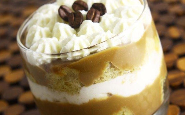 Em copos ou taças para sobremesa, intercale camadas de cubos de bolo, creme de café e chantilly. Com o auxílio de um saco de confeitar com bico pitanga, decore com chantilly e grãos de café.