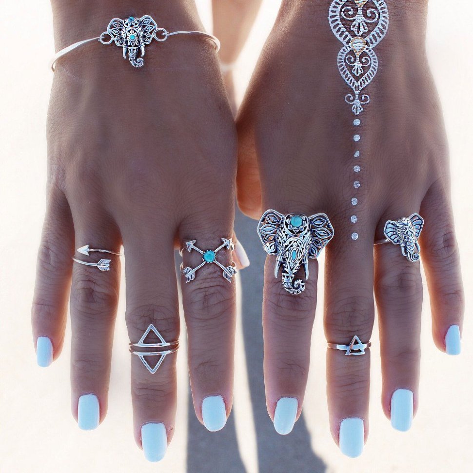 Anéis enormes com forma de animais com muitas pedras, e com as principais cores boho (azul, turquesa, vermelho e prata). Neste caso, você ainda pode usar um anel em cada dedo. Quanto maior melhor, como sempre.