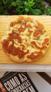 Misture todos os ingredientes e sove por 5 minutos. Deixe a massa fermentar por 2 horas coberta com um pano. Divida a massa em 2, e a abra com as próprias mãos em formato de disco. Em uma frigideira coloque bastante azeite, galhos de alecrim, e em fogo baixo coloque uma parte da massa. A cozinhe por 5 minutos, vire-a, coloque um pouco mais de azeite, e cozinhe mais 5 minutos Sirva em seguida.