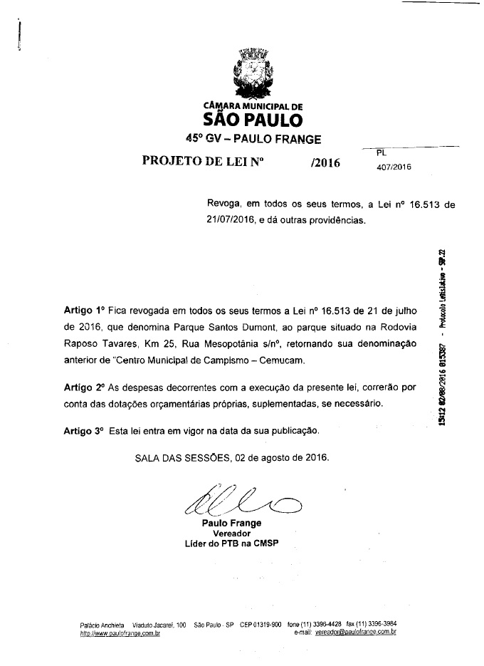 Ontem (04/08) o vereador Paulo Frange, responsável pelo projeto que alterou no nome do Parque Cemucam para para Parque Santos Dumont protocolou o pedido de revogação (Lei 16.531 de 21 de julho de 2016) para que o parque retomasse o nome anterior.