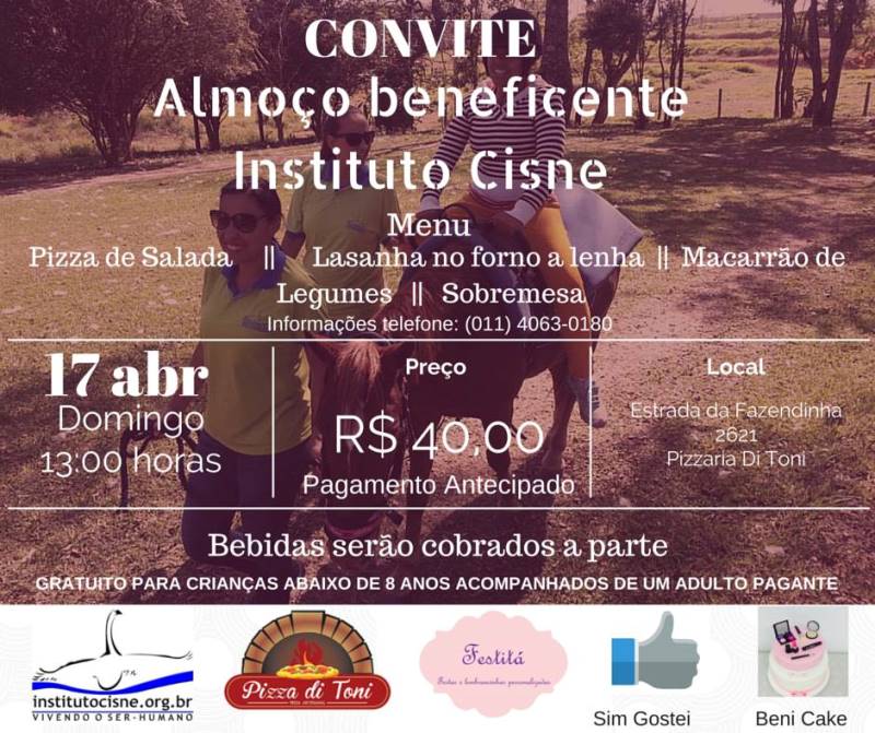 No próximo dia 17 de abril, às 13h, a Pizza di Toni promove o Almoço Beneficente Instituto Cisne, que acolher pessoas com limitação de autonomia psicossocial, buscando sua estabilidade psicológica e convivência social, respeitando suas diferenças por meio de uma metodologia própria.