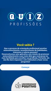 Disponível para os sistemas Android e IOS, com download gratuito, o aplicativo traz situações comuns às mais variadas profissões. A cada passo, o usuário deve escolher com qual delas mais se identifica. O teste ajuda o estudante por meio do autoconhecimento, fazendo-o pensar nas situações apresentadas e se imaginar desempenhando determinados trabalhos. O resultado mostra com qual área – Humanas, Exatas ou Biológicas e Saúde – o usuário tem mais afinidade. “O aplicativo não pretende oferecer respostas prontas, e sim ajudar o estudante a fazer as perguntas certas que vão levá-lo à tomada de decisão”, observa a professora do curso de Psicologia da UP, Samarah Freitas, que participou do desenvolvimento do quiz.
