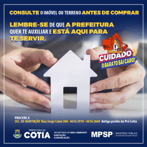 A Prefeitura de Cotia, por meio das Secretarias de Habitação, de Meio Ambiente e Agropecuária e de Comunicação, lançou a Campanha “Cuidado, O Barato Sai Caro”, em parceria com o Ministério Público. O objetivo da campanha é orientar o cidadão a não cair em golpes imobiliários em que, com frequência, estelionatários comercializam áreas públicas, loteamentos irregulares e áreas particulares invadidas.
