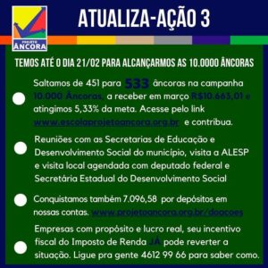 Uma das batalhas é pela conquista de Âncoras: pessoas físicas e jurídicas que se comprometam a doar algum valor a partir de R$ 20,00 todos os meses. Para manter o Projeto Âncora funcionando, seriam necessárias 10 mil Âncoras de R$ 20,00. “Desde que iniciamos a campanha, a nossa arrecadação vem dobrando dia a dia, mas ainda é insuficiente para garantir o Projeto neste momento”, explica Ana Letícia. Outras formas de contribuição, tanto para pessoas físicas como para pessoas jurídicas seria a destinação do imposto de renda devido e também a destinação da Nota Fiscal Paulista para o CNPJ do Âncora.